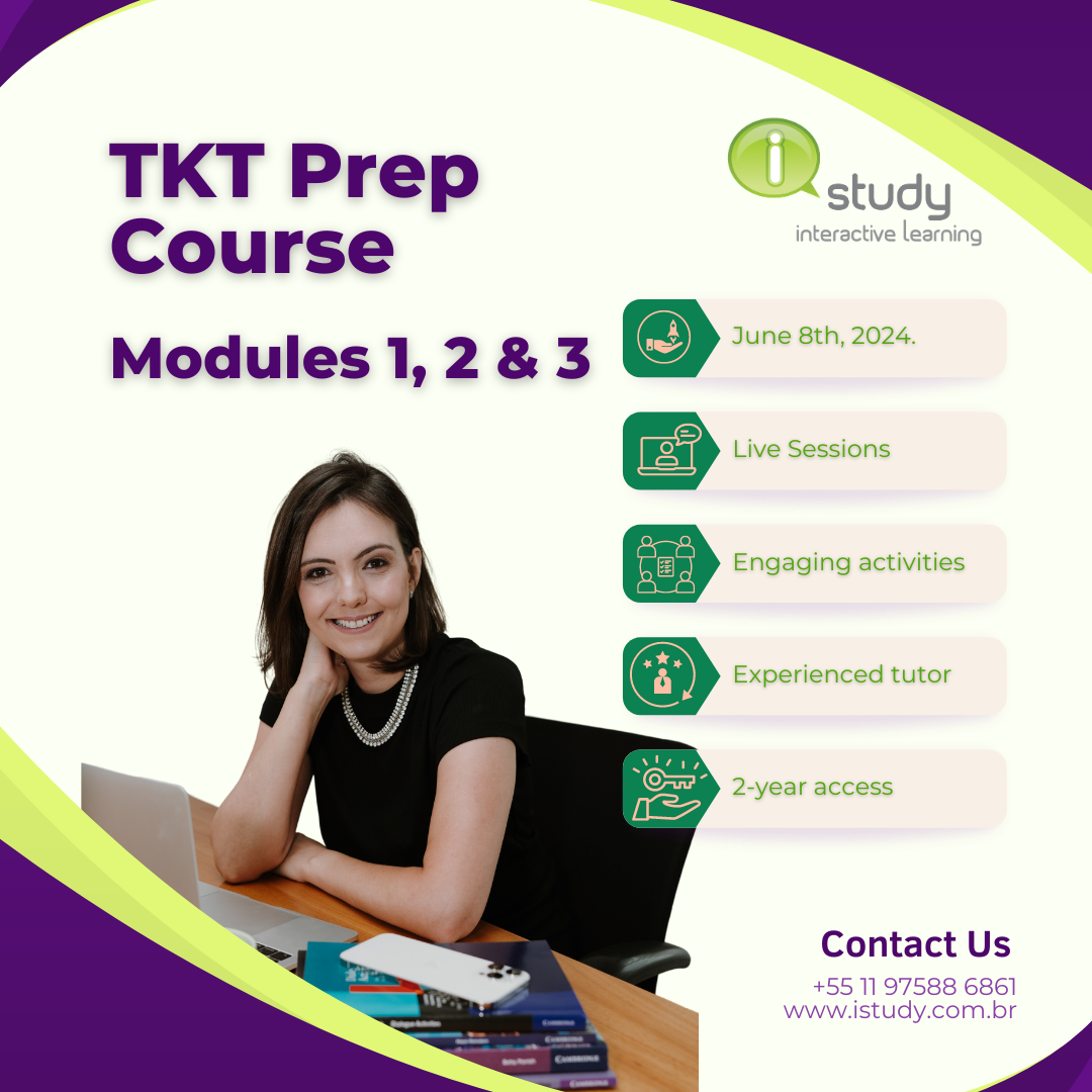Desbloqueie seu potencial como professor de inglês com o nosso abrangente curso de preparação para o TKT. Ministrado por meio de sessões ao vivo envolventes, nosso curso abrange todos os três módulos do exame TKT, equipando-o com o conhecimento e as habilidades necessárias para se destacar. Beneficie-se do orientação de uma professora especialista, discussões interativas e exercícios práticos projetados para aprimorar suas habilidades de ensino. Junte-se a nós para ganhar confiança, aprofundar sua compreensão dos princípios do ensino de idiomas e dar o próximo passo em sua carreira de ensino.